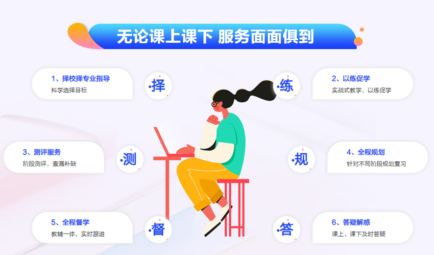 半年集训营:高级规划阶段+基础精讲阶段+暑期强化阶段+秋季模考提高阶段+ 冬季考前密押阶段(五大辅导阶段)