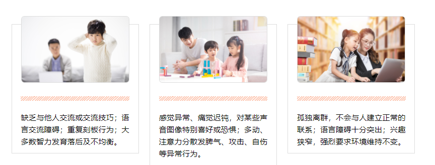 对于自闭症儿童来说,他们往往都存在社交障碍等问题。社交障碍的症状比较容易辨认:孤独离群、沉迷自我、言语障碍突出、难以正常语言交流、兴趣狭窄、行为刻板重复、难以应对环境变化……