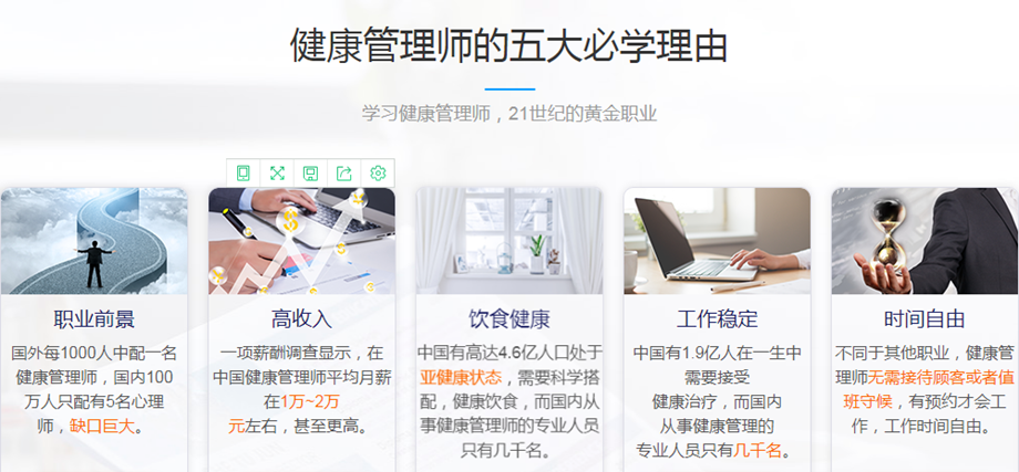 未来5到10年专业健康管理师缺口200万人,不得不说健康管理师将是一个非常好的就业方向,获得高薪工作。每个人都需要健康,健康管理师是可以干一辈子的黄金职业!学习健康管理师才能让你更加胜任所在的健康职业,工作更有价值。