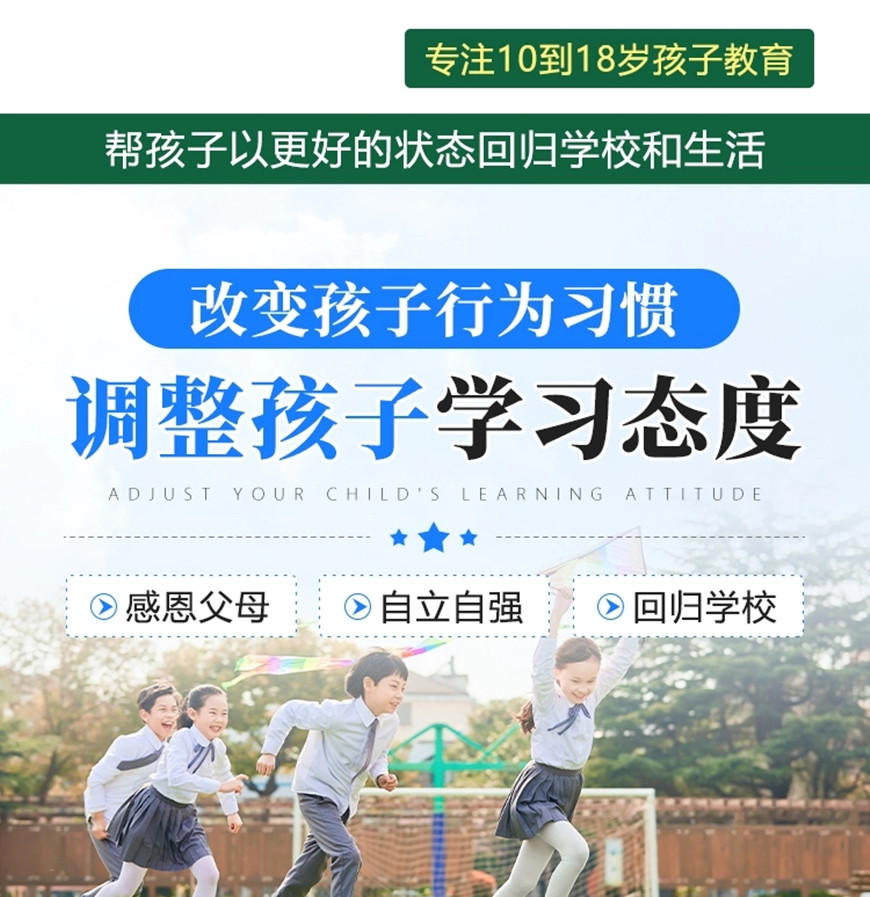 1、让叛逆孩子从点滴开始,学会热爱祖国,感恩社会,学会为人处事,学会孝顺父母,感恩他人,学会自理自立,学会自尊自强,学会自爱和自我保护,学会交流沟通,学会团结协作,学会好学上进,学会强身健体,学会崇美向善,努力朝着成人、成才、成功的目标迈进;