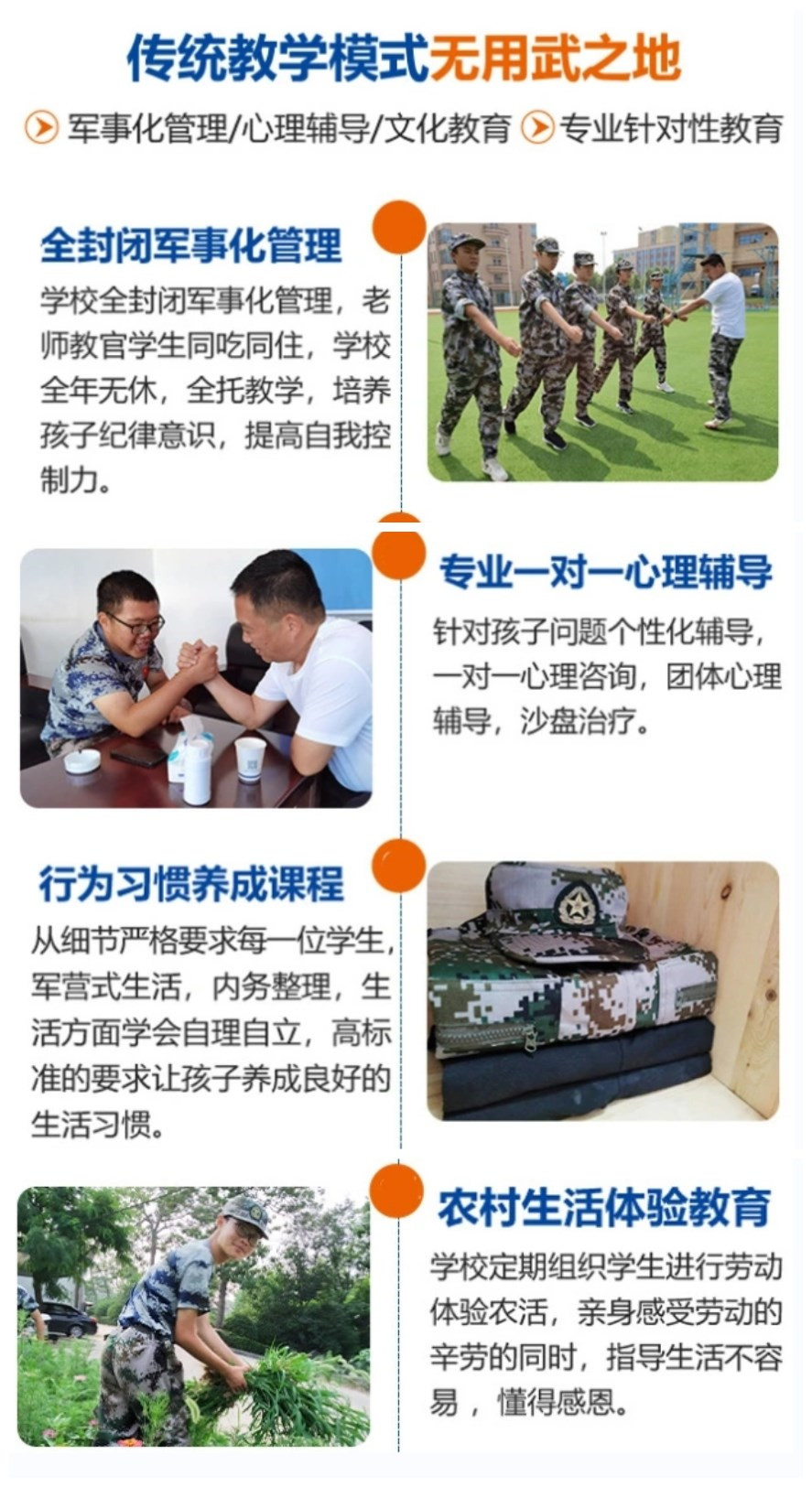 1、叛逆少年封闭式军事化特训学校采用多位一体引导法,采用心理暗示矫正、军体科目训练、感恩体系课程、行为习惯养成、心里拓展活动、国学文化内容、社交礼仪讲述及法律法规常识综合性教育培训方法。