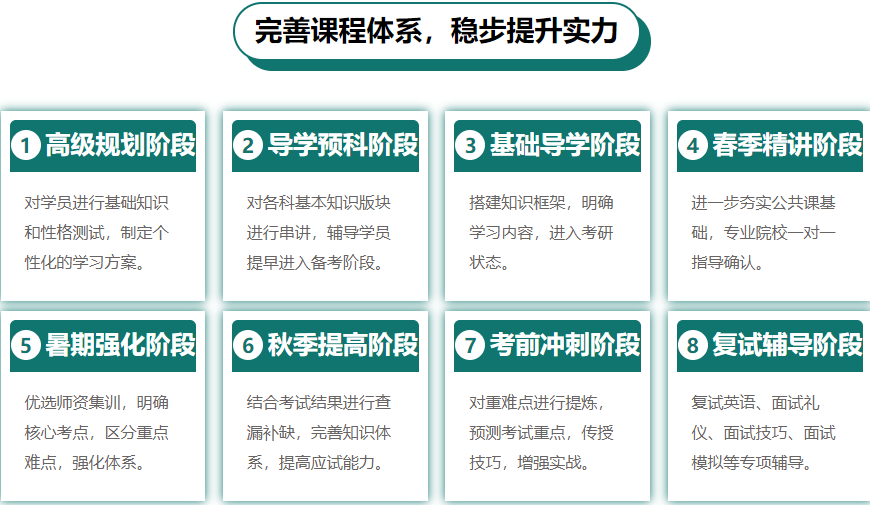 这项课程适合正在备战考研的学员,针对想要在期间提升学习效率的学员开设,考研机构专业的老师将会为学员制定个性化的复习计划,根据不同学员的学习情况和学习进度,为学员制定不同的课程指导,帮助学员高效利用的时间,帮助学员掌握新的考研方向,同时进行针对性提升,让学员能够进行全面的提升。